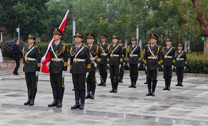 升旗仪式开始,国旗护卫队的队员们迈着整齐而有力的步伐,护送着鲜艳的五星红旗朝着升旗台稳健前行。他们身姿挺秀,步伐坚毅,每一步似乎都在倾诉着对祖国的赤诚与挚爱。