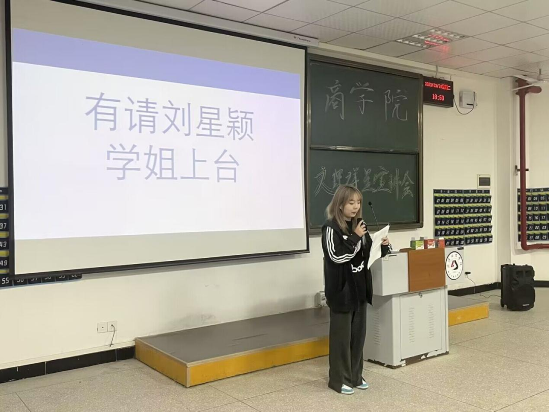 刘星颖是班级班长兼团支书,校奖学金获得者。她向同学们分享了自己的学习经验,强调:学习和生活要会制定符合自身条件的计划、设立目标;要充分利用自身的优点;认知不完美才是常态,不放任自己虚度光阴;调整好自己的心态,把握机会敢于争取。她鼓励22级同学们大学不设限,认真对待大学四年。