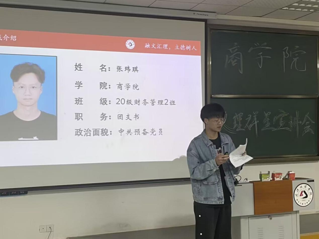 张玮琪是班级团支书,校2021-2022年和润单项奖学金获得者。他从自己担任班委和团学干部的经历谈起,强调大家要多参加学校举办的各种活动,介绍学院和学校各类学科竞赛和参赛技巧。他鼓励22级同学们要励志成为一个有理想、敢担当、能吃苦、肯奋斗的优秀青年。