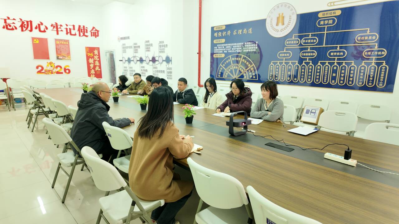 汇报结束后,党总支书记朱启贵对学院 2025年度学生工作取得的成绩给予充分肯定。他指出,全体学工人员始终坚守育人初心,履职尽责、真抓实干,在学生日常管理、思想引领、成长服务等方面付出了大量心血,取得了显著成效。同时,他也针对工作中存在的不足提出明确要求,强调要进一步强化责任意识、创新工作方法、提升服务质量,切实关注学生成长需求,助力学生全面发展。