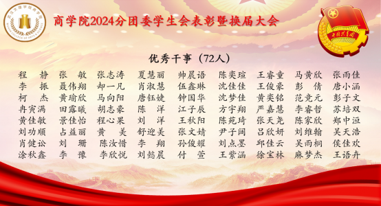 优秀干事(72人):程静、张敏、张志涛、夏慧丽、帅晨语、陈奕瑄、王睿童、马黄欣、张雨佳、李振、聂伟翔、却一凡、肖淑慧、伍鑫林、沈佳佳等72人