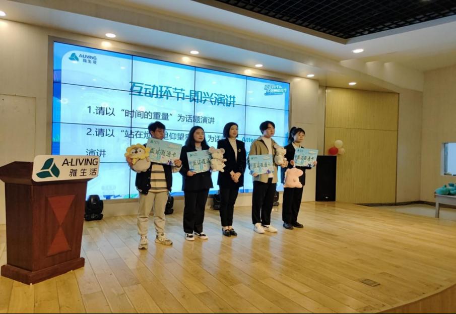 她向毕业生详尽介绍了雅生活集团情况以及行业发展趋势;重点推荐了雅生活企业覆盖面积广,服务团队庞大,服务项目广泛的雄厚实力和平台优势;分享了雅生活集团乐活π计划----雅生活集团管培生相关情况。她向毕业生推荐雅生活集团招聘管培生分项目管理、品质运营岗等9个类别岗位。雅生活集团将全力保障员工薪资、五险一金以及假期。雅生活企业前景好,潜力大,拥有全业态的就业岗位。企业的乐活Π培养计划具有完整的培养体系。
