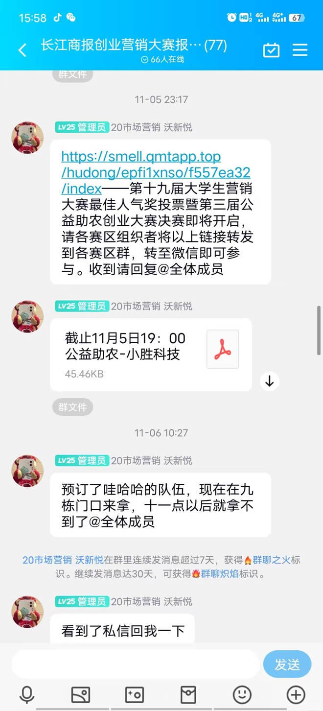 大赛在报名之际,为了让更多人了解和参与到比赛中来,我们采取进班宣传的方式,通过号召和鼓励,效果非常明显。随后我组建起了长江商报比赛报名群,大概有100多名同学参与。为了比赛的有序性效率,我组建了队长群,直接和队长们进行着比赛的沟通。