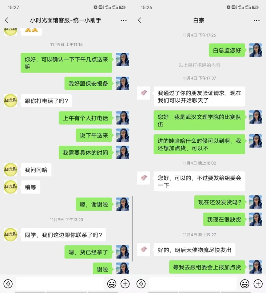 安排好校内的队伍之后,在这期间我每天都不厌其烦地跟组织方沟通,着手解决货源问题以及跟组委会一系列的工作对接。参赛的同学们销售的热情很高,每次的进货都供不应求,我不得不跟负责人一次次地沟通和申请,虽然很辛苦,但是我乐在其中。