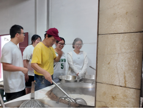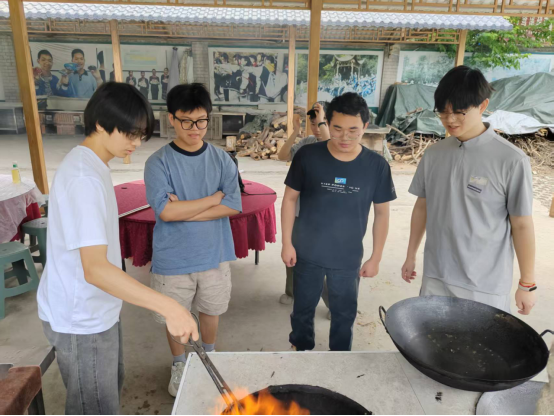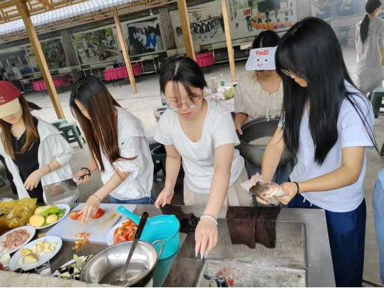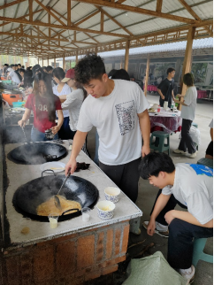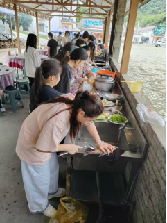 土锅灶前,一场别开生面的“劳动烹饪课”火热进行。同学们分组协作,生火组掌握“松枝引火、硬柴稳焰”的火候秘诀,炊事组钻研“刀工配比、调味均衡”的烹饪技巧。当投资学专业学生团队创新烹制的“独冠天下”(利用边角食材创意摆盘的观赏菜)惊艳亮相时,不仅展现了变废为宝的创新思维,更诠释了“厉行节约、反对浪费”的劳动风尚。投资系主任刘老师感慨:“原担心安全与厨艺问题,却惊喜看到学生们在安全规范下展现出的创造力——火候控制精准、菜品创意迭出,这正是劳动教育激活实践潜能的生动案例。”