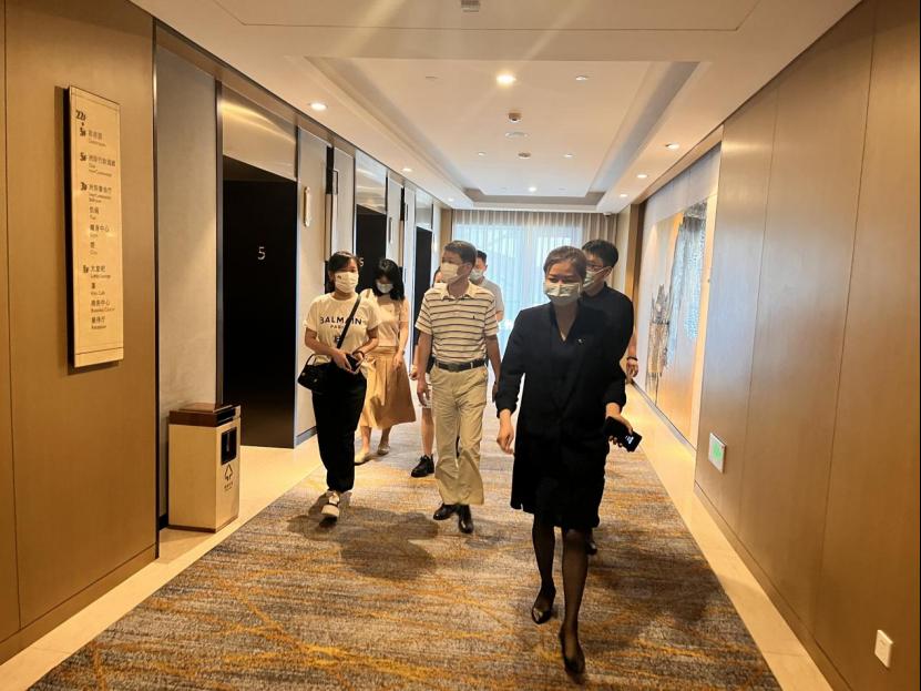 在武汉洲际酒店人力资源部总监王娴妹女士、人力资源经理王章明女士以及武汉国博假日酒店前厅部经理曾威的陪同下,艾校长一行参观了酒店的大堂、客房、行政酒廊等地方,了解了学生工作环境和内容。