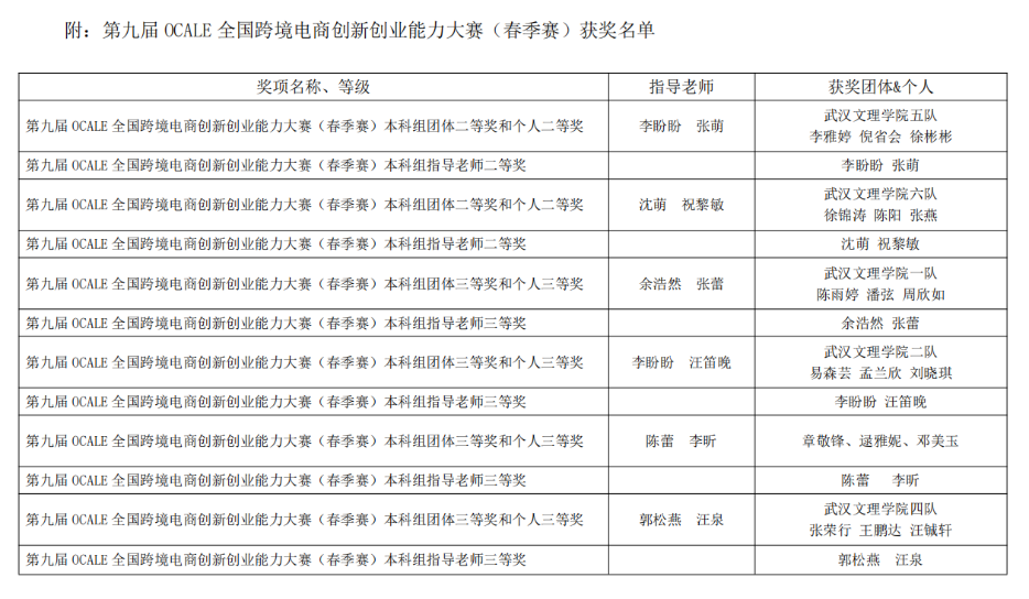 在2023年3月落幕的第九届OCALE全国跨境电商创新创业能力大赛(春季赛)中,我校yl7703永利李雅婷学生团队、徐锦涛学生团队荣获本科组团体二等奖。李盼盼、张萌、沈萌、祝黎敏等老师荣获本科组指导老师二等奖。陈雨婷学生团队、易森芸学生团队、章敬峰学生团队、张荣行学生团队荣获本科组团队三等奖。余浩然、 张蕾、李盼盼、 汪笛晚、陈蕾、李昕、郭松燕、汪泉等老师荣获本科组指导老师三等奖。