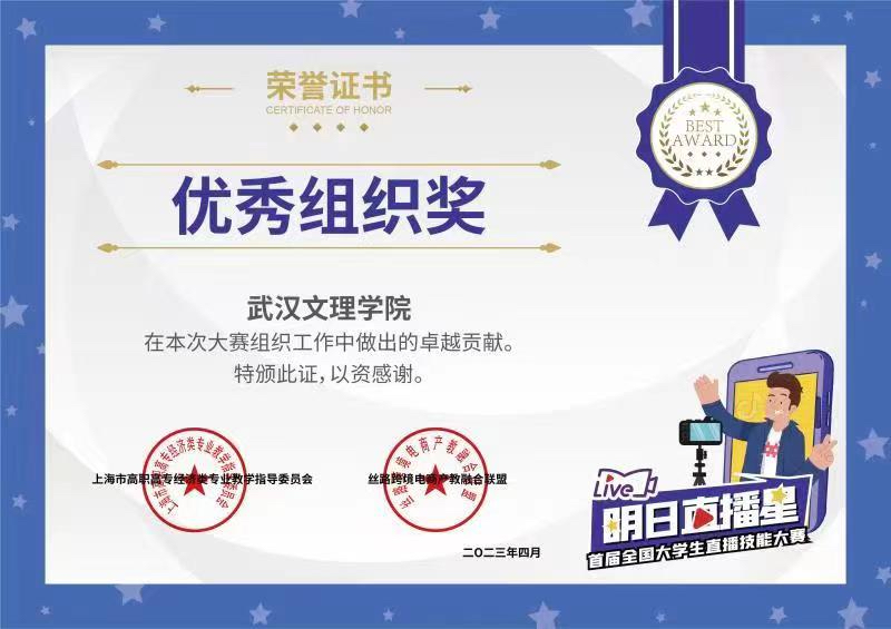 教师余浩然、李盼盼指导学生荣获抖音举办的明日直播星--首届全国大学生直播技能大赛二等奖,yl7703永利集团荣获该赛事优秀组织奖。陈蕾、祝黎敏老师指导学生荣获全国大学生智慧供应链创新创业挑战赛三等奖。