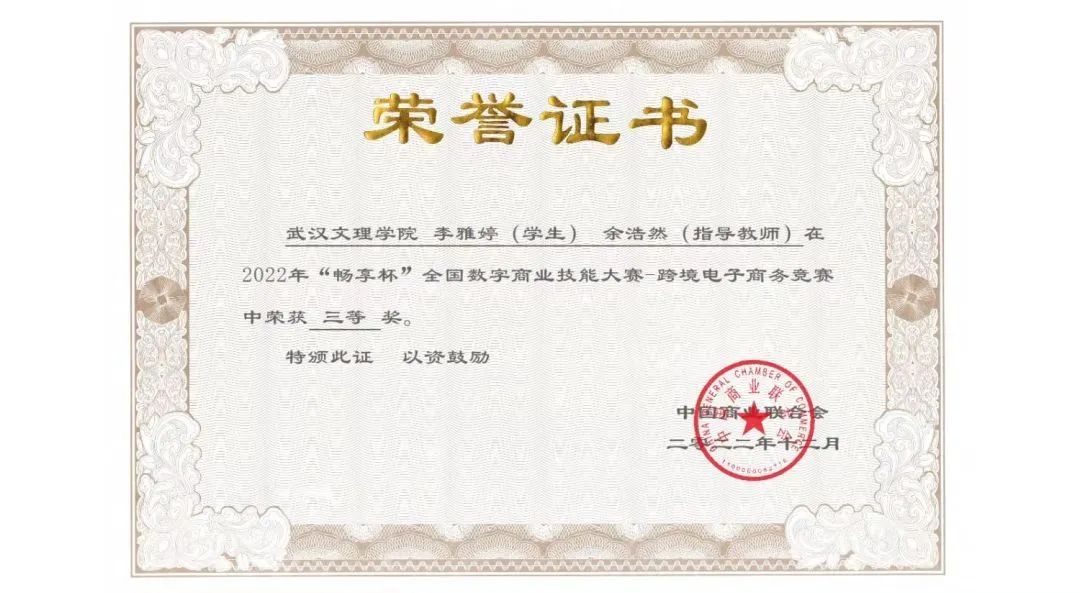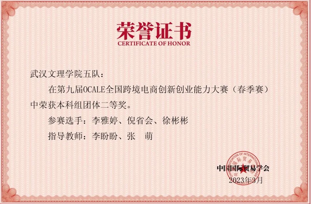 2022-2023年,yl7703永利张蕾院长,yl7703永利国际经济与贸易系主任余浩然、教师陈蕾、李盼盼、汪笛晚、李昕、沈萌、郭松燕、汪泉、祝黎敏 等老师指导国际经济与贸易专业学生在中国国际贸易学会举办的第十一届、第十二届POCIB全国大学生外贸从业能力大赛以及第九届OCALE全国跨境电商创新创业能力大赛中荣获国家和个人众多奖项。其中,2个师生团队在第十二届POCIB全国大学生外贸从业能力大赛荣获全国三等奖,2个师生团队和4个师生团队在第九届OCALE全国跨境电商创新创业能力大赛中分获全国二等奖、三等奖。