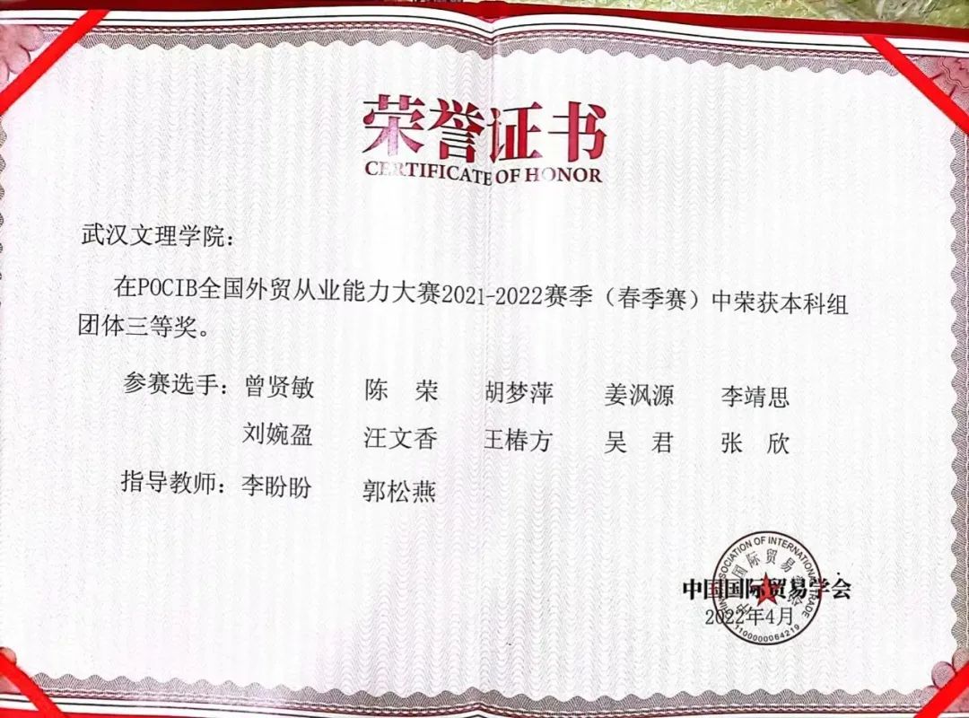 2022年中国国际贸易学会主办的“第十一届POCIB全国外贸从业能力大赛(春季赛),详情请点击:【学科竞技】yl7703永利2019级国贸学生荣获第十一届POCIB全国大学生外贸从业能力大赛团体三等奖